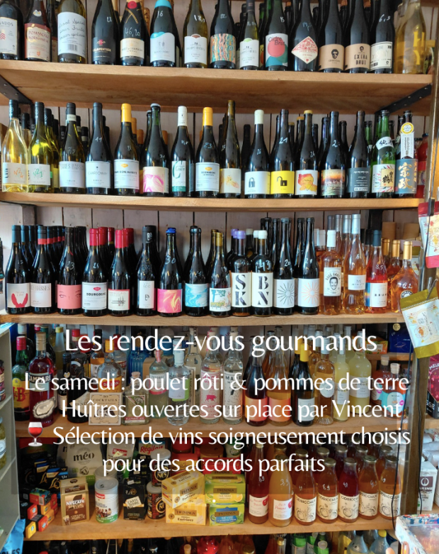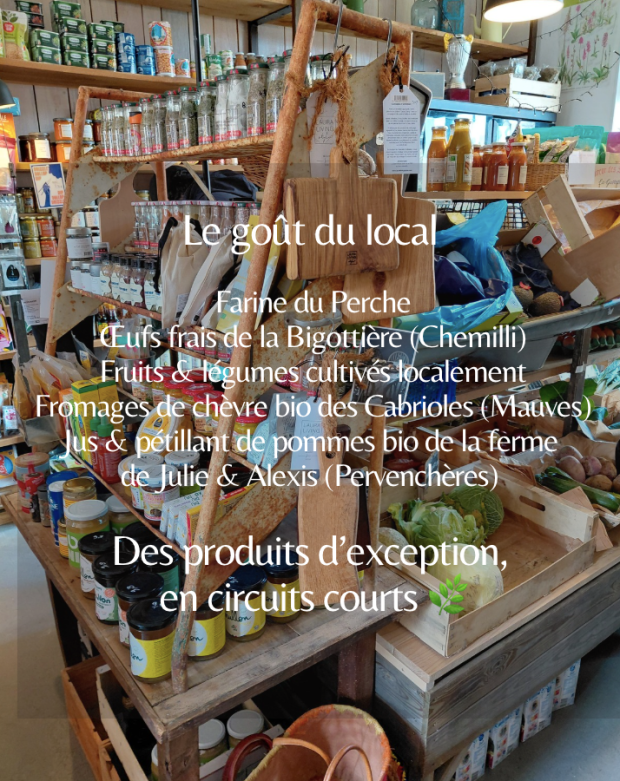 Produits locaux soigneusement sourcés, saveurs d’Italie et du Japon, poulet rôti du samedi (sur réservation !), fromages de chèvre du Perche, vins coups de cœur, semences bio, service postal, laverie, presse locale… Ici, on vient faire ses courses, mais surtout on vient échanger et trouver des inspirations recettes.
