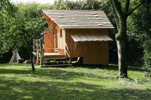 Au fond du verger, derrière la spirale fleurie ou potagère, se dresse la cabane en bois sur pilotis qui attend petits et grands pour vivre de trépidantes aventures !